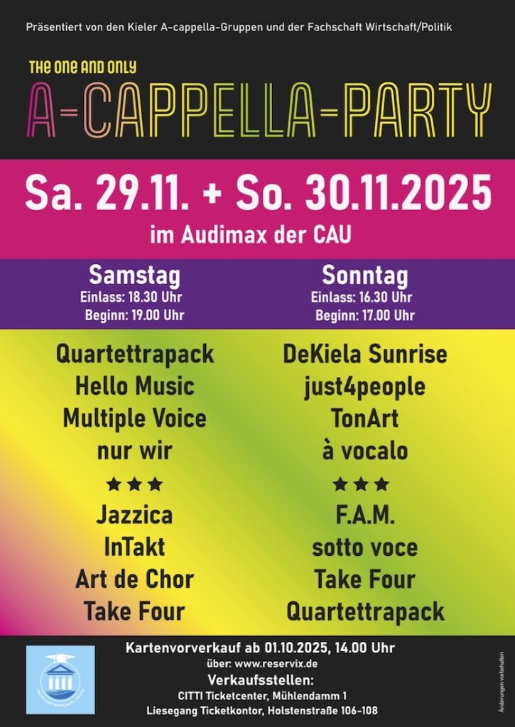 Das Jahr runden wir musikalisch wieder mit der A-Cappella-Party ab. Tickets könnt ihr ab dem 1. Oktober um 14 Uhr bekommen. Schnell sein lohnt sich – die Karten sind erfahrungsgemäß schnell vergriffen!